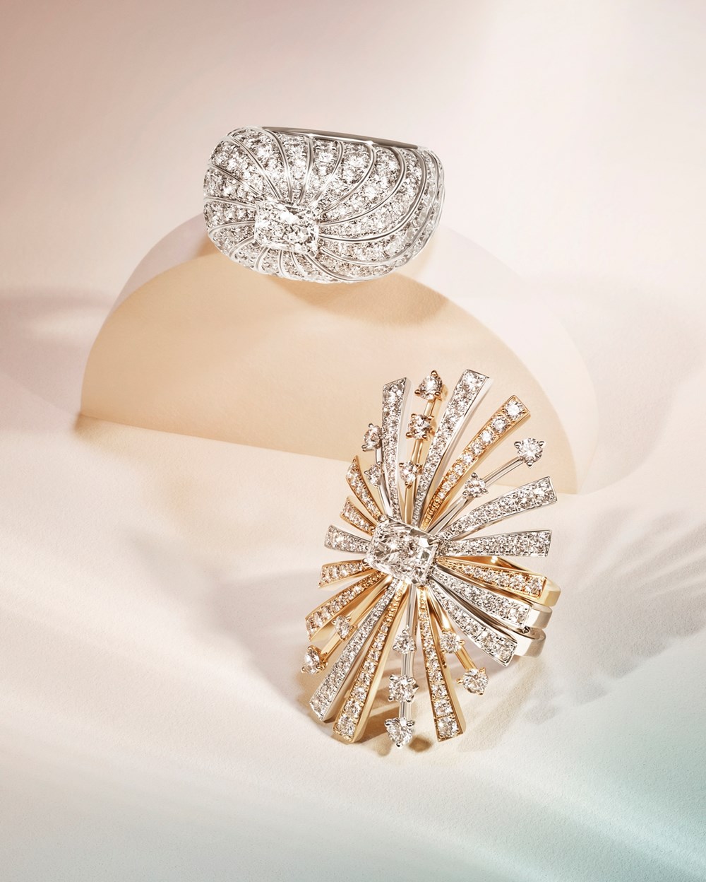 الذهب والألماس الأبيض: يُعاد ابتكار شكل الشمس في تصميم ذكي لخاتم وأقراط من الذهب الأصفر والأبيض، مرصعة بألماس أبيض لامع. وتجسد هذه التصاميم رؤية «FRED» للمجوهرات المتعددة الاستخدام، التي باتت من أبرز سمات الدار. ويمكن ارتداء كل قطعة بطرق متعددة، وفي وسط كلٍّ منها يتلألأ حجر ألماس أبيض بقصة مشعة؛ ليضيف توهجاً خاصاً يناسب ذوق كل امرأة.
