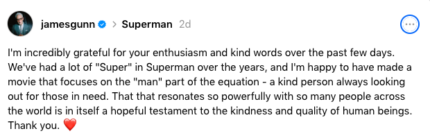 وبعد عرض الفيلم، كتب المخرج جيمس غَن عبر وسائل التواصل الاجتماعي إنه يشعر بالفخر لإنتاج نسخة من سوبرمان تُبرز “جانب الإنسان” في شخصيته، واصفا إياه بأنه “شخص طيب يهتم دائما بمن يحتاجون المساعدة”.