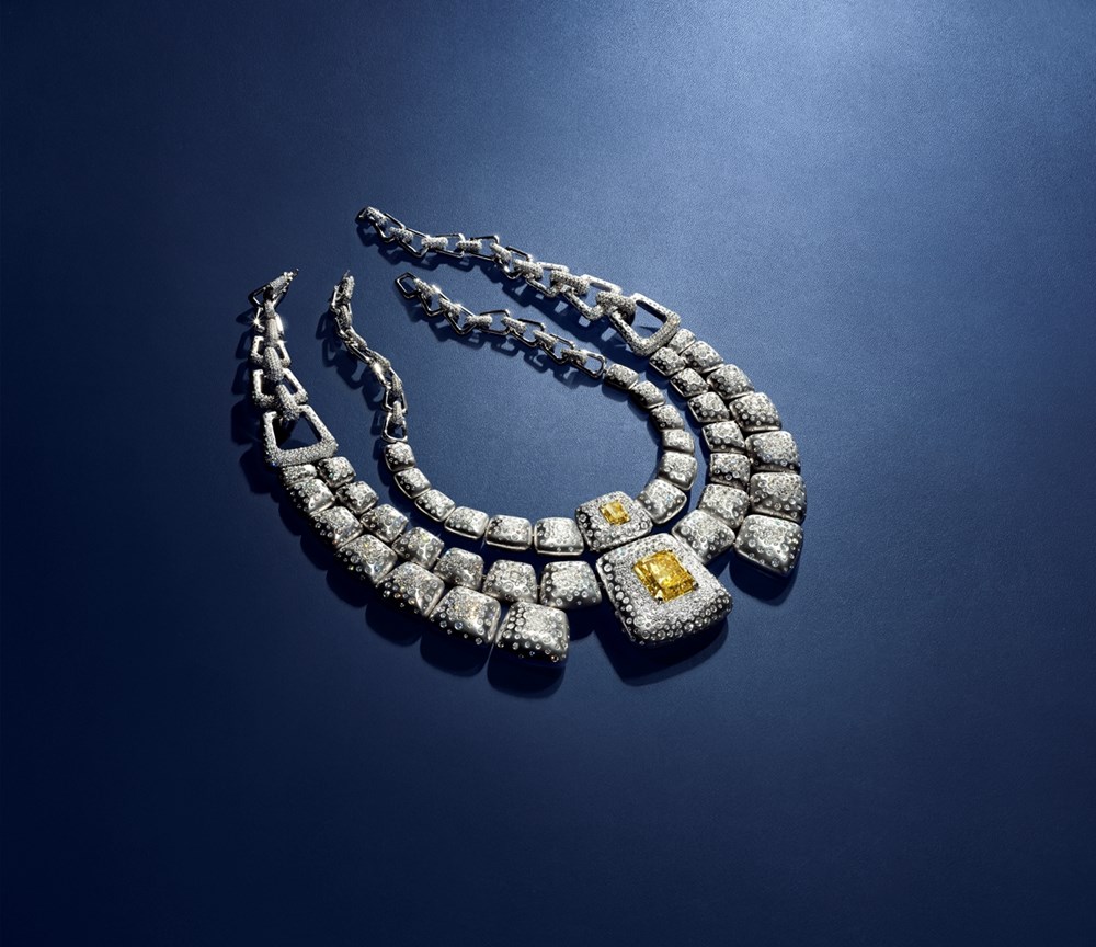 وهناك أيضاً، عقد يجمع 3,298 ألماسة يبلغ وزنها الإجمالي 103.30 قراريط، ويتميّز بتصميم مبتكر قابل للتعديل، حيث يمكن ارتداؤه بأربعة أساليب مختلفة: عقد بحلقات ثلاث، أو عقد مزدوج، أو تشوكر، أو عقد مركزي بتصميم قلادة.