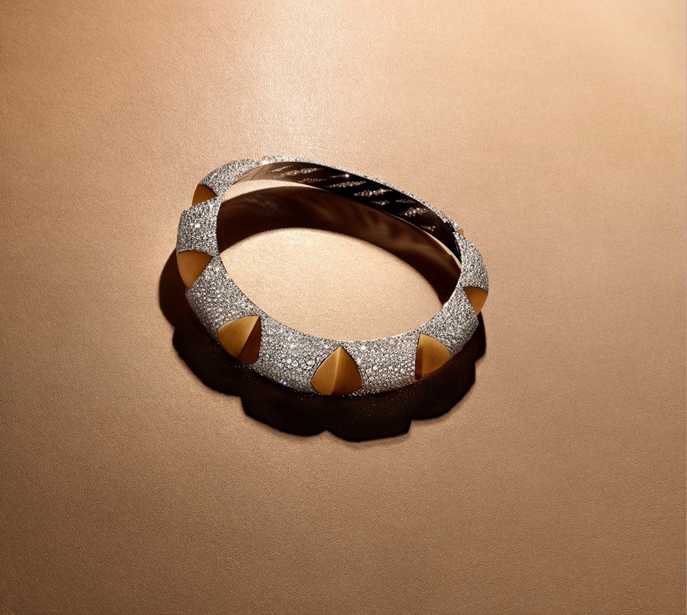 قوّة منحوتة في أنقى صورها. يحمل الذهب المصقول شكلاً نقياً تمزّقه مخالب الأسد، في شقوق جريئة تخترق المعدن، وتفسح المجال أمام الضوء المرصّع بالألماس. ولا تظهر القوّة في الشكل، بل نشعر بها في العمق.