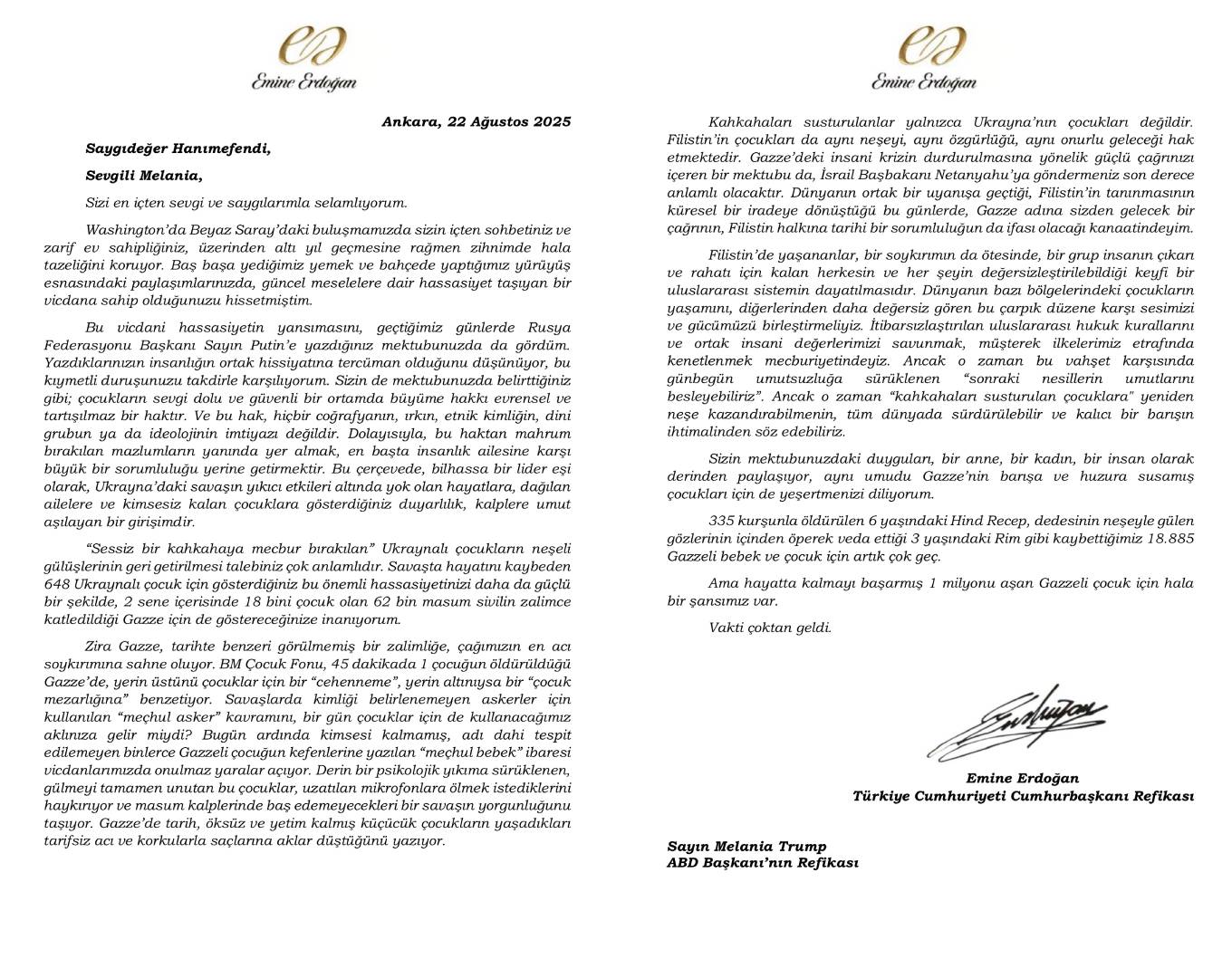 وأفادت السيدة الأولى التركية بأنها وجدت في كلمات ميلانيا ترامب بالرسالة تعبيرا صادقا عن وجدان الإنسانية جمعاء، مؤكدة تقديرها لهذا الموقف القيم.