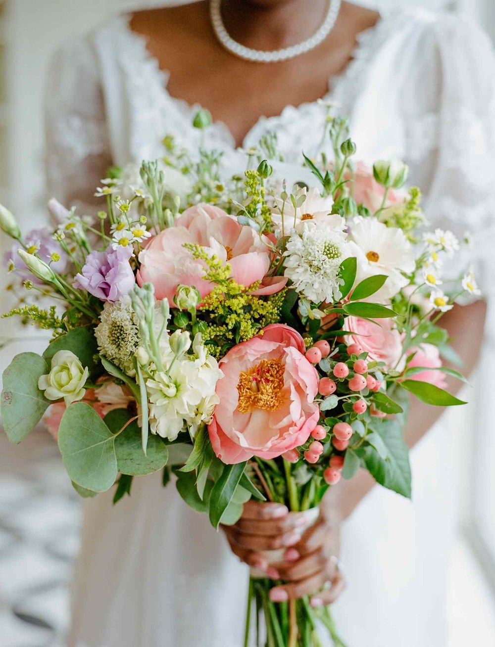 4. المسكة الحرة أو الطبيعية: عبارة زهور متنوعة مربوطة يدويًا بخيط أو شريط، وتبدو كأنها قُطفت للتو من الحديقة.