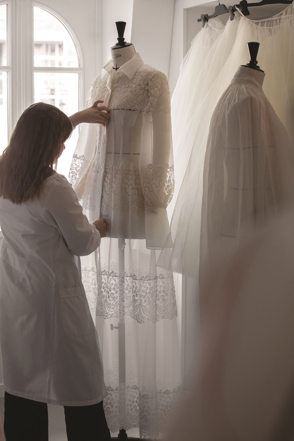 في فستانٍ بأسلوب القميص، تم تكثيف 550 ساعة عمل؛ لترجمة معمارية دقيقة من الأورغانزا، والنسيج المخرّم المضفّر، وأنماط مخرّمة مشغولة يدوياً. هنا، لا يقتصر الأمر على تقنية خياطة متقنة، بل على قدرة على التعامل مع 40 متراً من النسيج، كأنه بناء هشٌّ قائم على الضوء والظل. هذه الإطلالة تستحضر وجوه العمارة الرومانية، التي أعادت كيوري رسمها بخيوط قماشية.