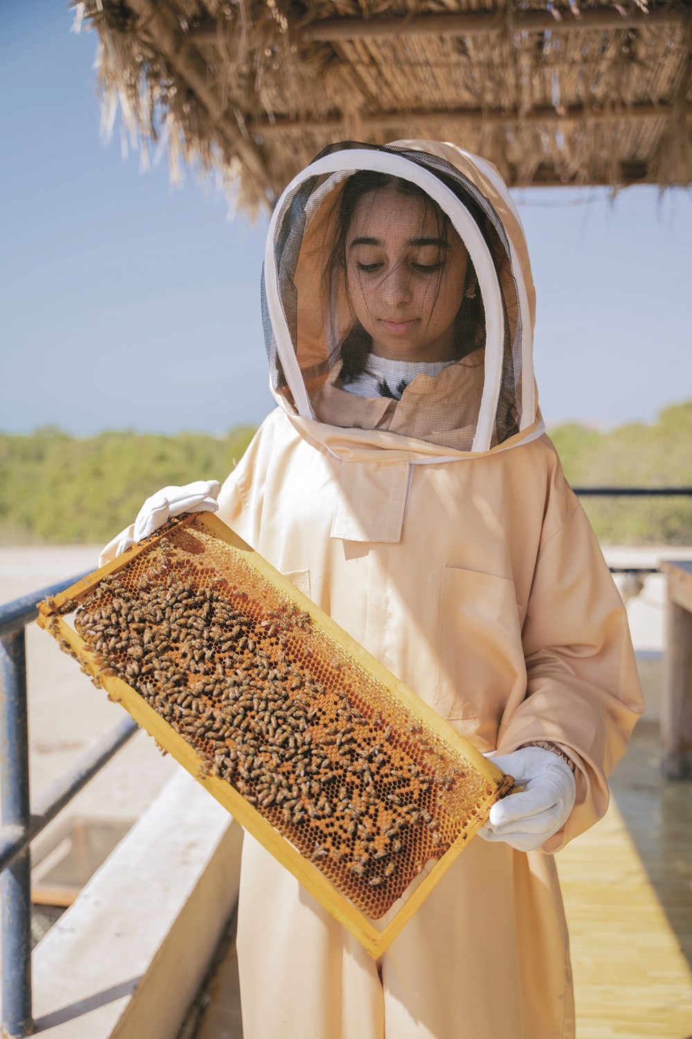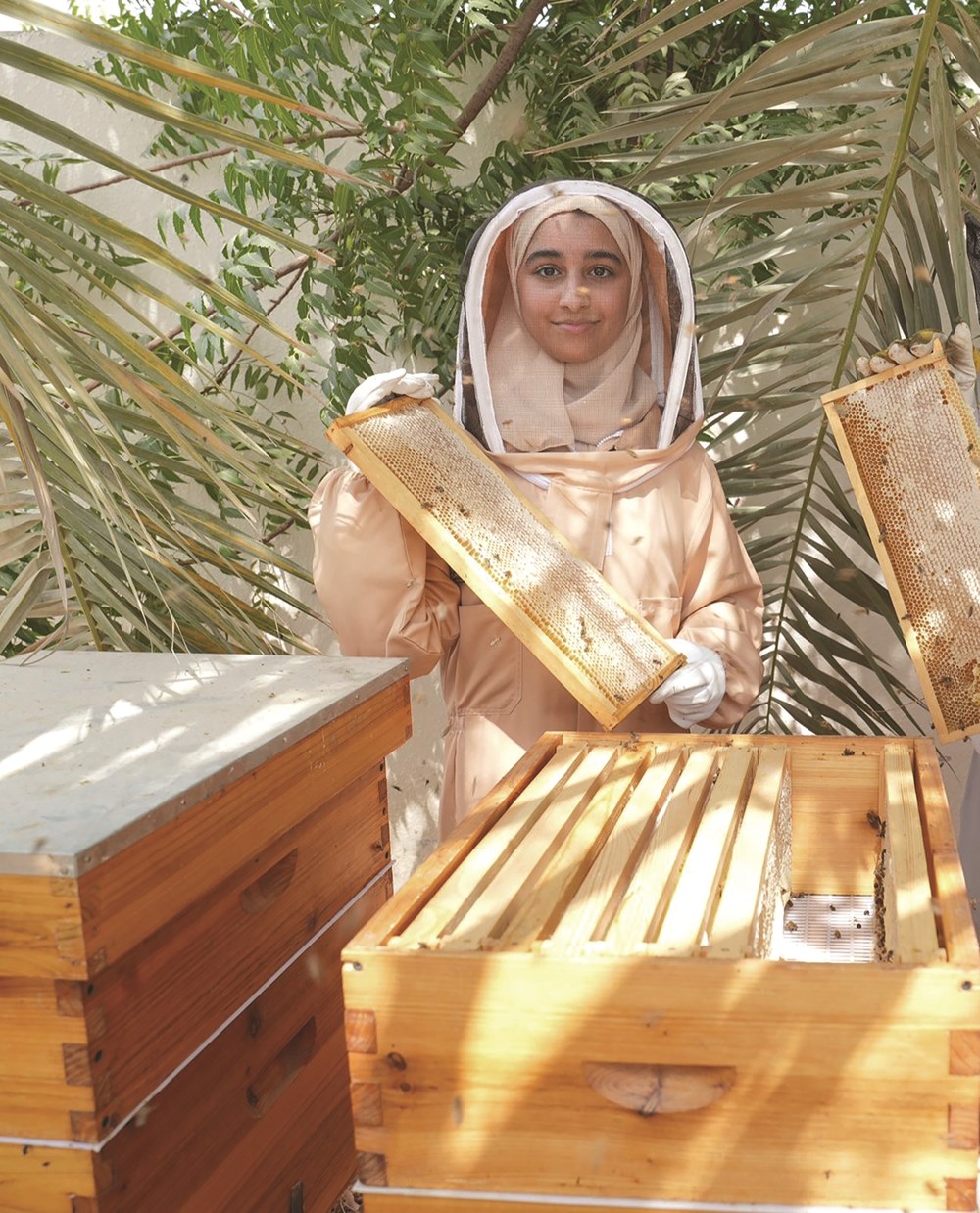 رغم أن عمرها لم يتجاوز الـ13 عاماً، إلا أن مهرة حمد النقبي، من إمارة رأس الخيمة، صنعت لها مكانة مميزة كأصغر نحّالة إماراتية، وأصغر رائدة أعمال في تجارة العسل وأدوات المناحل. بالنسبة لمهرة، لم يكن النحل مجرد هواية عابرة، بل أصبح جزءاً من حياتها اليومية ومصدر شغفها الأكبر؛ لتؤسس مشروعها الخاص، تحت اسم «المهرة لتجارة العسل وأدوات المناحل».