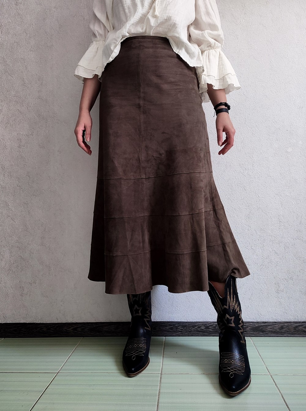 تجسد هذه الإطلالة أناقة غربية أنيقة، تتمحور حول تنورة من جلد الغزال البني الغني، وتنساب بنعومة وانسيابية، ما يضفي على قماش التنورة المرن دفئاً وعمقاً، مكملاً تماماً للسترة المُربعة، والكنزة المُحبوكة بلون الجمل، وعند تنسيقها مع حذاء جلدي بكعب عالٍ، تضفي سحراً ريفياً أنيقاً، ويُبرز الحزام العريض مع إبزيم فيروزي جمال الخصر، ويجمعان الألوان الترابية في إطلالة خريفية متناسقة.