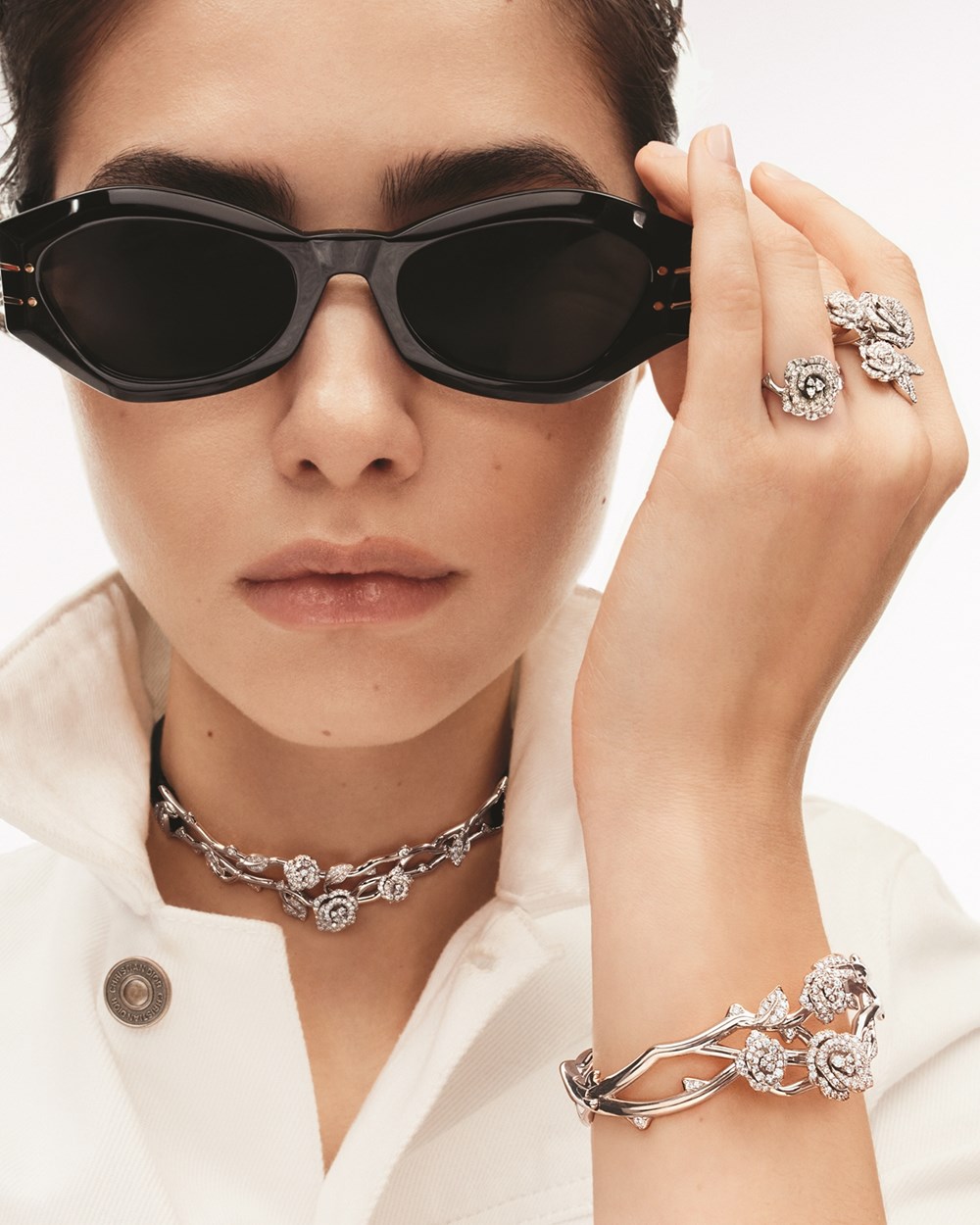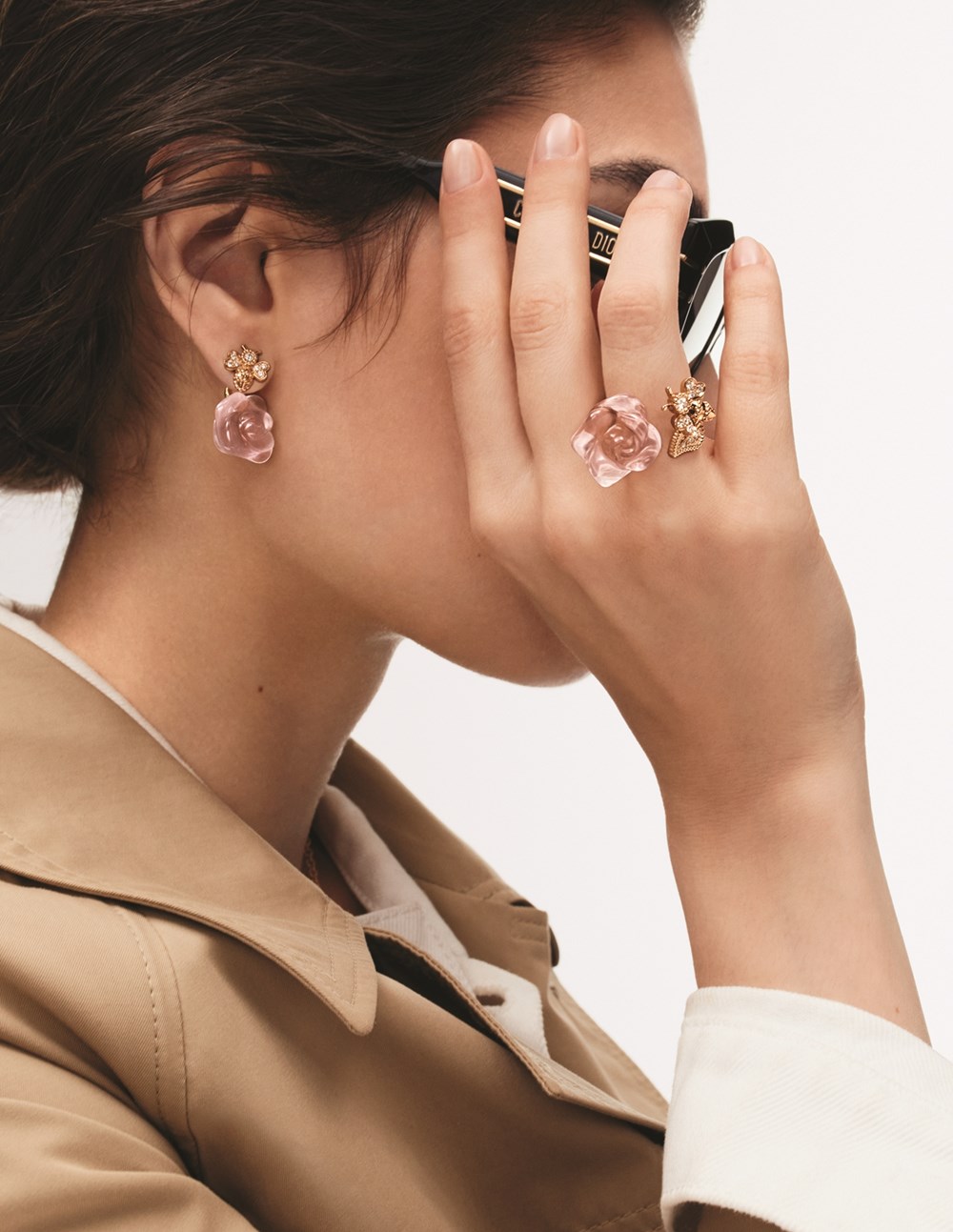 تتجسد الورود، هنا، في تصاميم «روز ديور باغاتيل» (Rose Dior Bagatelle)، مستمدةً طابعها الرومانسي من حدائق الورود الباريسية. وتتألق، أيضاً، في قطع مجوهرات «روز ديور بريه كاتيلان» (Rose Dior Pré Catelan)، المشغولة بذهب وردي مرصّعٍ بأحجار الكوارتز الوردي.