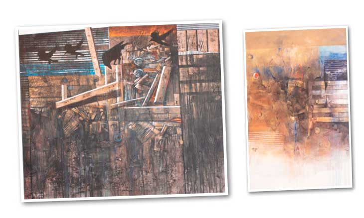 والحال أنّ تجريد الجالوس، وما دامت أعمال معرضه هذا تتخذ الأبواب علامة محورية، كونية على نحو ما لأنها تحكي سردية اقتلاع واغتصاب واحتلال واستيطان، لا يملك الفكاك عن رفد السطوح بفضاءات تصويرية مصغّرة، ليست تشخيصية تماماً (كما هي حال الغربان، على سبيل المثال الحصري)، بقدر ما يُنشئها تضادٌ محسوب بين ألوان مستنيرة مشرقة وأخرى كامدة معتمة، في منتصف اللوحة تارة، أو في ثلثها السفلي أو العلوي تارة أخرى. وإذْ تقوم الألواح الخشبية بما يشبه «ترقيع» الفضاء، أو تشبيك مساحاته وفق هندسة متغايرة عالية التأثير من حيث جاذبيتها البصرية، فإنّ اللون شبه الموحّد هنا، في تدرجّات البنيّ والرمادي والترابي، ينقلب إلى معادل بصري صانع لمعنى مضاف في السياق الإجمالي للعمل؛ سواء احتوى على عنصر دالّ واقعي جزئياً، ما عدا الغربان بالطبع، أو اقتفى السيرورة ذاتها من مزج التعبير بالتجريد.