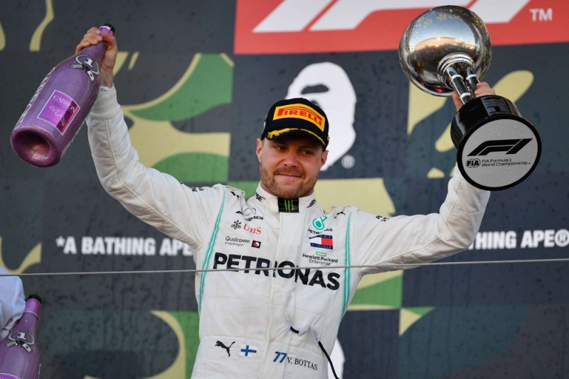 اليابان – كان احتفال الصانع الألماني مرسيدس مزدوجا بفوز سائقه الفنلندي فالتيري بوتاس بالمركز الأول في سباق جائزة اليابان الكبرى على حلبة سوزوكا ضمن الجولة السابعة عشرة من بطولة العالم لسباقات فورمولا - 1، وحسم الفريق لقب الصانعين للمرة السادسة تواليا.