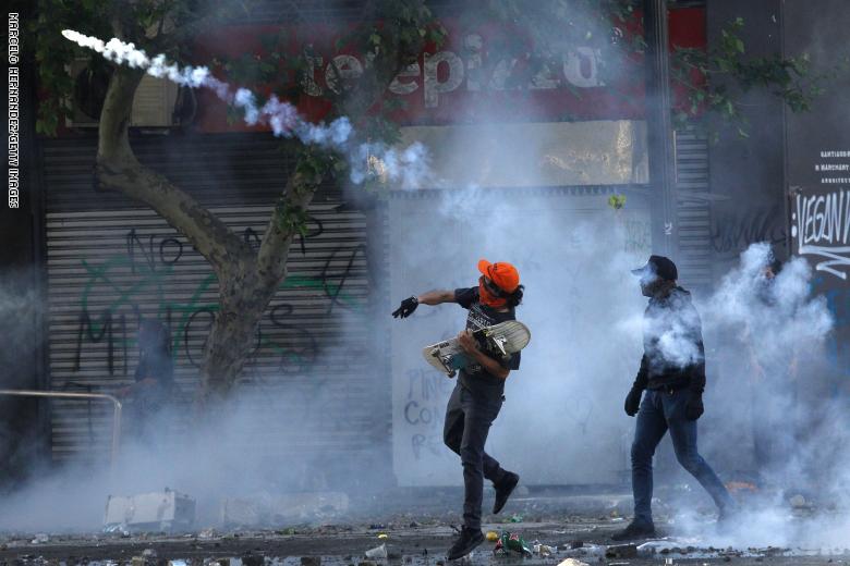 وأفادت قناة «24 هوراس» التلفزيونية التشيلية بأن المسيرات التي خرجت في ميداني بلازا إيطاليا ونونوا بوسط العاصمة التشيلية اتسمت إلى حد كبير بالسلمية، على الرغم من قيام مجموعة صغيرة من المحتجين بإلقاء الحجارة على عناصر الشرطة الذين أطلقوا الغاز المسيل للدموع لتفريقهم. كما استخدمت قوات الأمن التشيلية قنابل الغاز المسيل للدموع لتفريق المتظاهرين في مدينة فالبارايسو الساحلية.