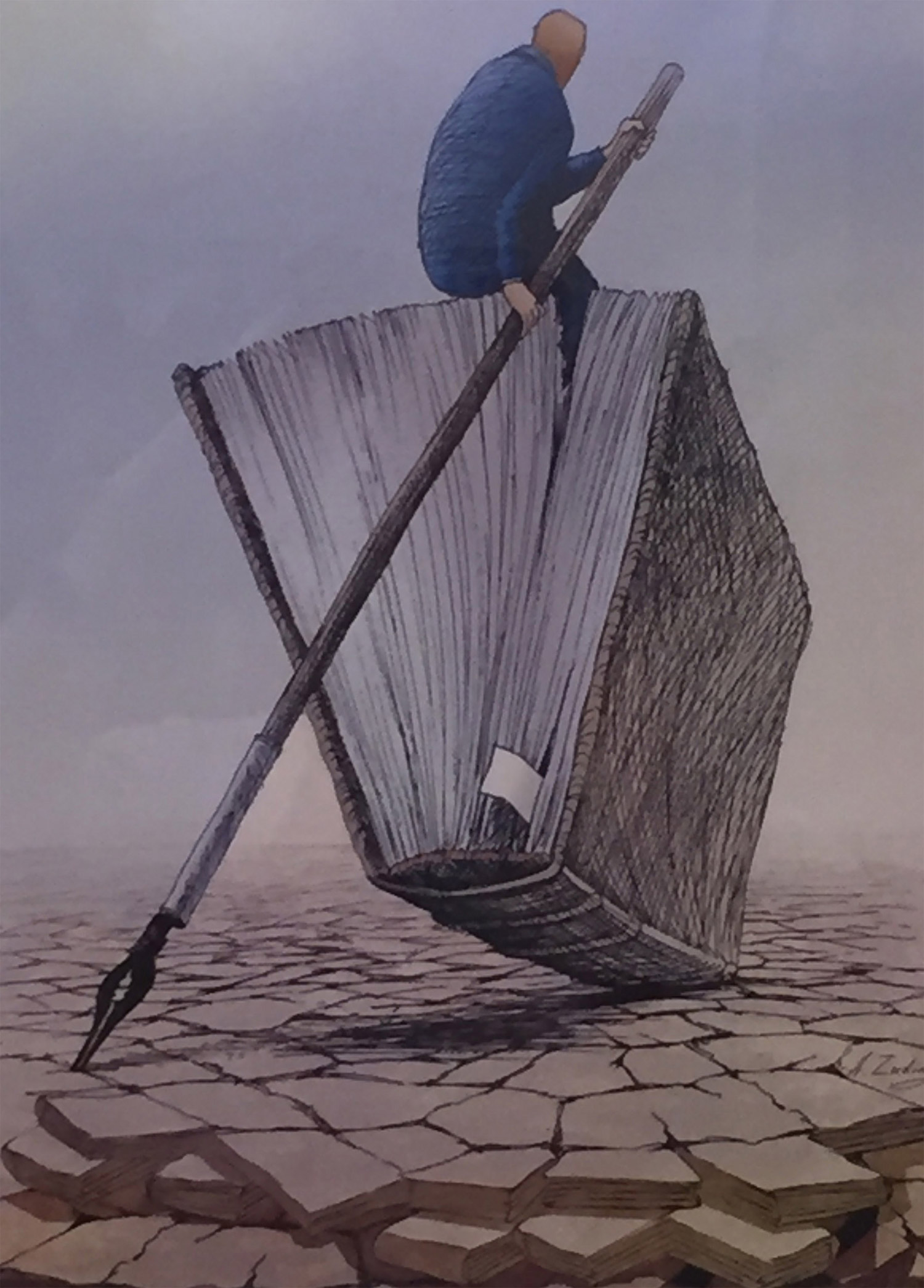 انطلقت أعمال المعرض من منصّة ثيمة الفكر والثقافة، والقوى الناعمة على وجه العموم، إذ اتخذ الفنانون مرايا العقل والمعرفة والإبداع والتنوير والقراءة والحروف الأبجدية وما إلى ذلك من مقوّمات الوعي ومغذّيات الروح معابر إلى فضاء البحث عن “الإنسان”، ذلك المخلوق الذي إن لم يستردّ وعيه، فلن يصير بالإمكان العثور عليه، وسيبقى في شروده وضلاله وافتقاده لكينونته.