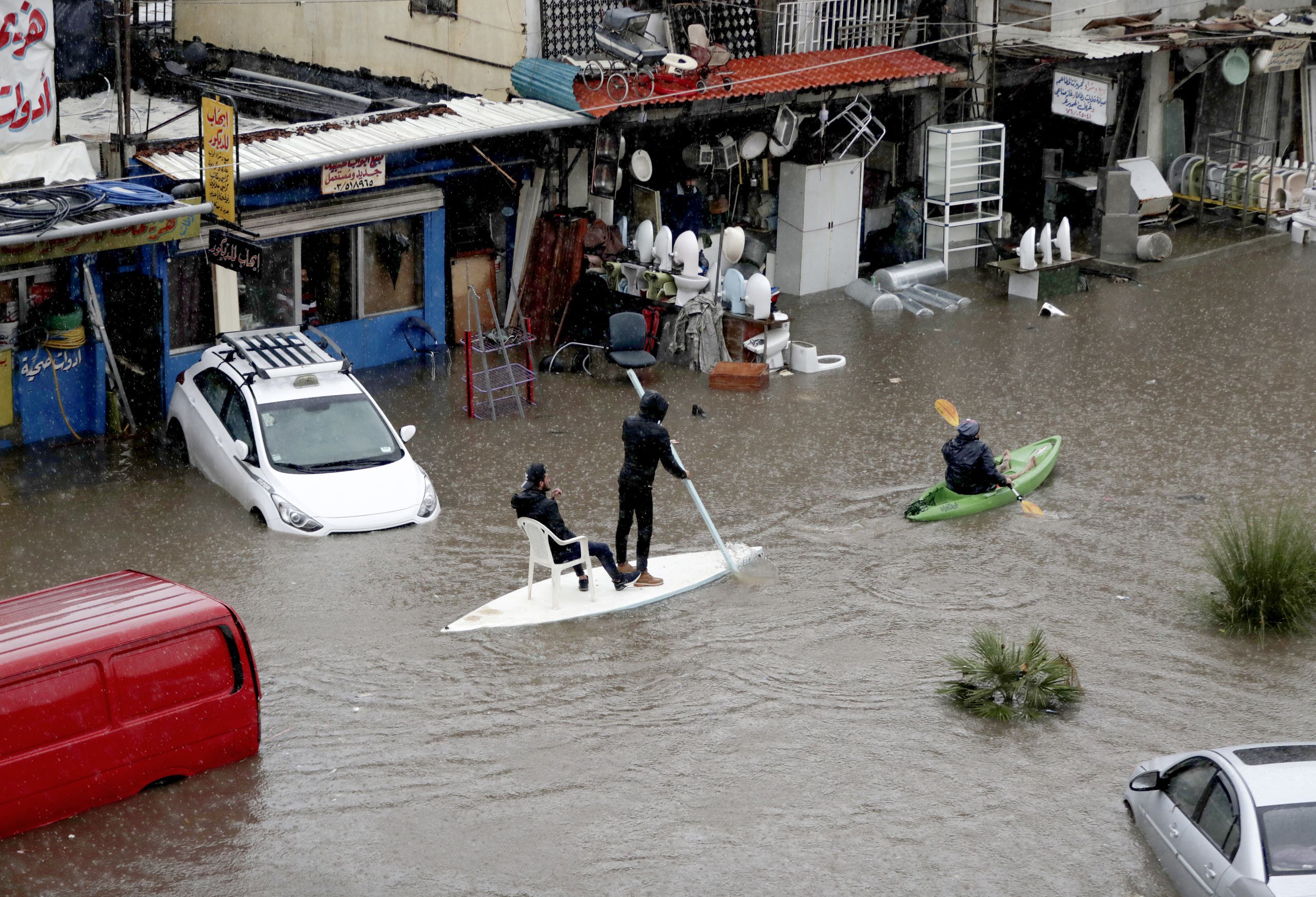 وفي صور لافتة، يظهر بعض المواطنين يتنقلون وسط السيول في زوارق على طرقات بالعاصمة بيروت، ما يعكس سخرية الوضع المؤلم الذي يعيشه اللبنانيون بسبب الإهمال.