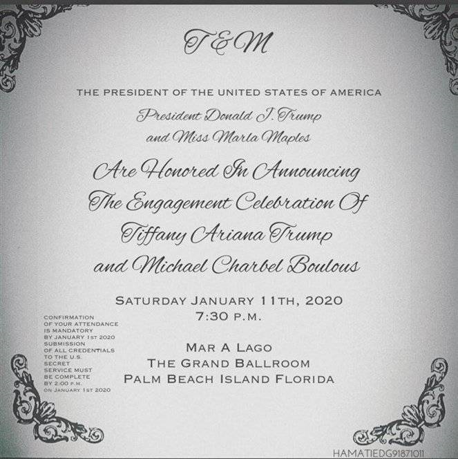 وحددت عائلتا ترامب وبولس، يوم 11 يناير 2020، موعدا لحفل خطوبة تيفاني ومايكل في فلوريدا، في منتجع مارالاغو الفاخر الذي يمكله الرئيس الأمريكي دونالد ترامب.