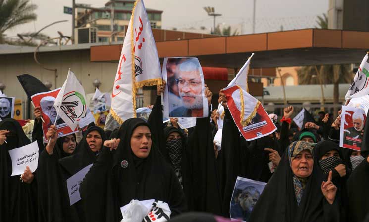 بغداد - (أ ف ب) - شارك آلاف العراقيين وهم يهتفون “الموت لأمريكا” السبت 4-1-2020 في بغداد في تشييع رئيس فيلق القدس في الحرس الثوري الإيراني قاسم سليماني ونائب رئيس هيئة الحشد الشعبي العراقي أبو مهدي المهندس اللذين قتلا الجمعة في ضربة أميركية، ما أثار مخوف من اندلاع حرب إقليمية بالوكالة بين واشنطن وطهران.