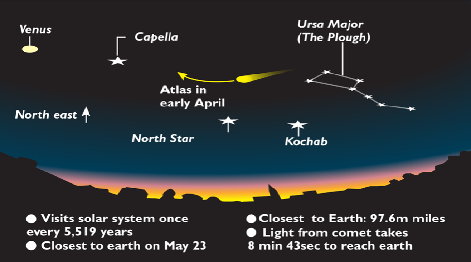 ومن دراسة أطلس، علموا أيضاً أنه لا يشكل أي خطر، وبأنه سيظهر في أمسيات الأرض الربيعية لامعاً، حتى للعين المجردة، مع أنه سيكون بعيداً عنها 115 مليون كيلومتر. مع ذلك، سينافس بإشراقه ثاني الأجرام لمعاناً في السماء بعد القمر، وهي كوكب الزهرة، حين تبدو صباحاً وعند غروب الشمس بشكل خاص.