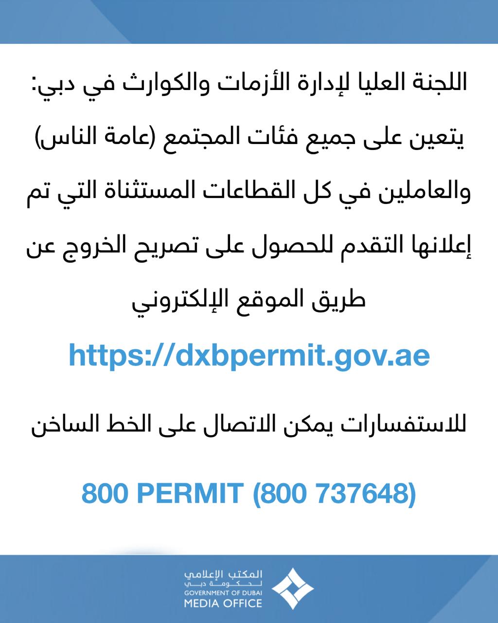 أعلنت اللجنة العليا لإدارة الأزمات والكوارث في دبي عن إطلاق الموقع الإلكتروني dxbpermit.gov.ae لكل من يرغب في التسجيل للحصول على ترخيص لمغادرة المنزل خلال فترة التعقيم الشامل لإمارة دبي والتي بدأت مساء أمس السبت وستستمر لمدة أسبوعين وعلى مدار 24 ساعة يومياً، حيث أن التسجيل عبر هذا الموقع والحصول على الترخيص من خلاله شرط أساسي للخروج من المنزل لأفراد المجتمع من عامة الناس، لتأمين الاحتياجات الضرورية سواء الغذائية أو الصحية أو لإجراء الفحوصات المتعلقة بفيروس كورونا المستجد.