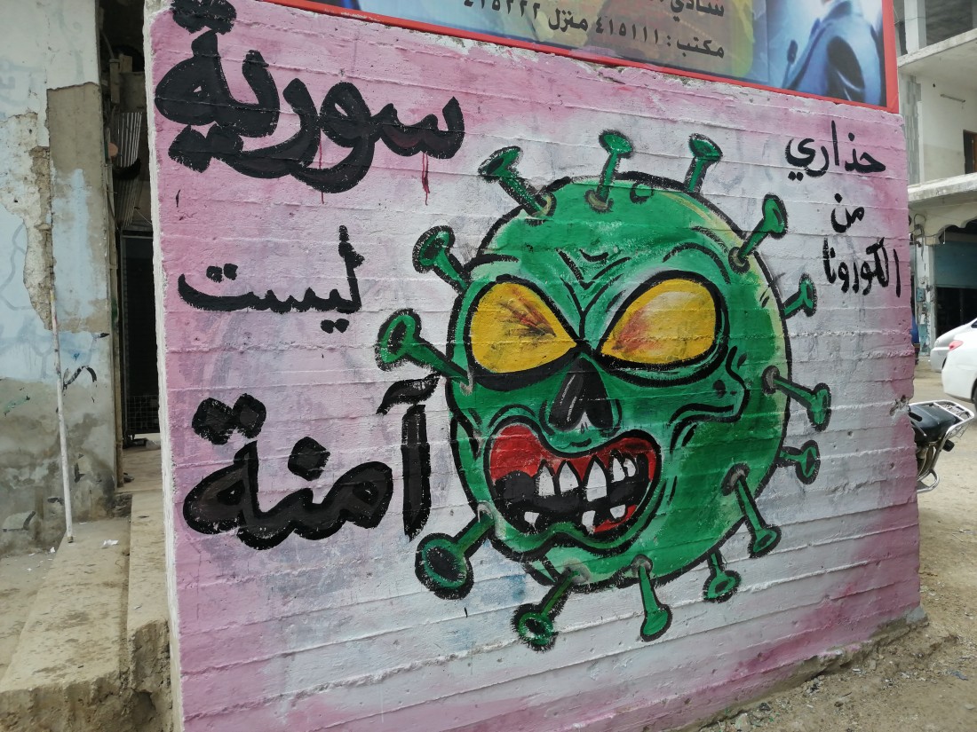 لكن من بين الركام في إدلب، شمال غربي سوريا، يحاكي رسام الغرافيتي عزيز الأسمر برسوماته الفيروس الفتاك، والذي ما فتئ يعاند البشرية الساعية إلى التخلص منه.