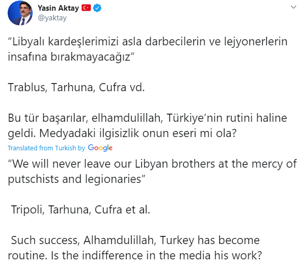 ودخلت تركيا على خط تأزيم الوضع في البلاد، عبر مستشار رئيس حزب العدالة والتنمية التركي الحاكم، ياسين أقطاي، هذه المرة، فقد هنأ المسؤول التركي ميليشيات الوفاق على التطورات الميدانية الأخيرة الحاصلة، مؤكداً أن بلاده "وفت وأنجزت ما وعدت به حكومة الوفاق".