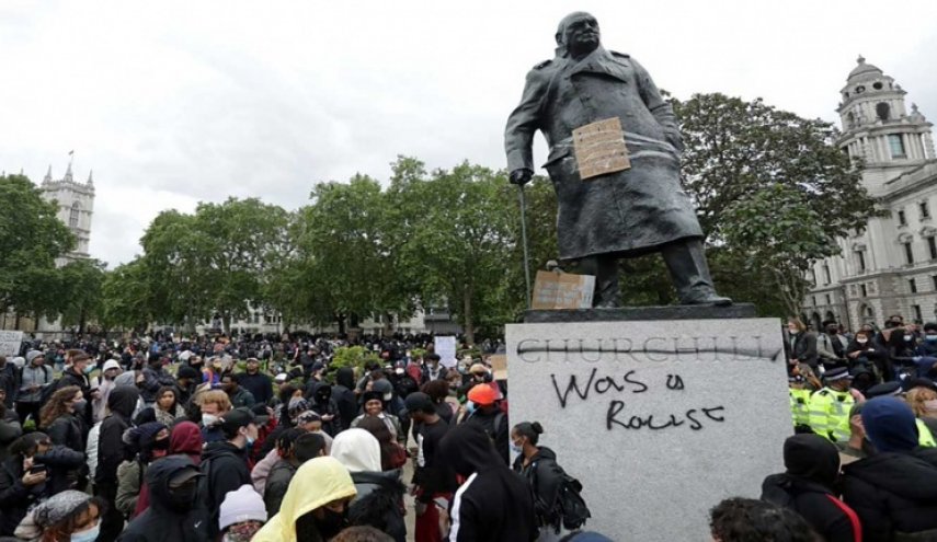 ومن هذه التماثيل الموضوعة على قوائم المتظاهرين نصب تاريخي للزعيم الإنجليزي ونستون تشرشل الذي يتهم بتبني وجهات نظر عنصرية بيضاء، وبكونه مسؤولاً عن سياسات وحشية في الهند "درة تاج" الإمبراطورية البريطانية السابقة.