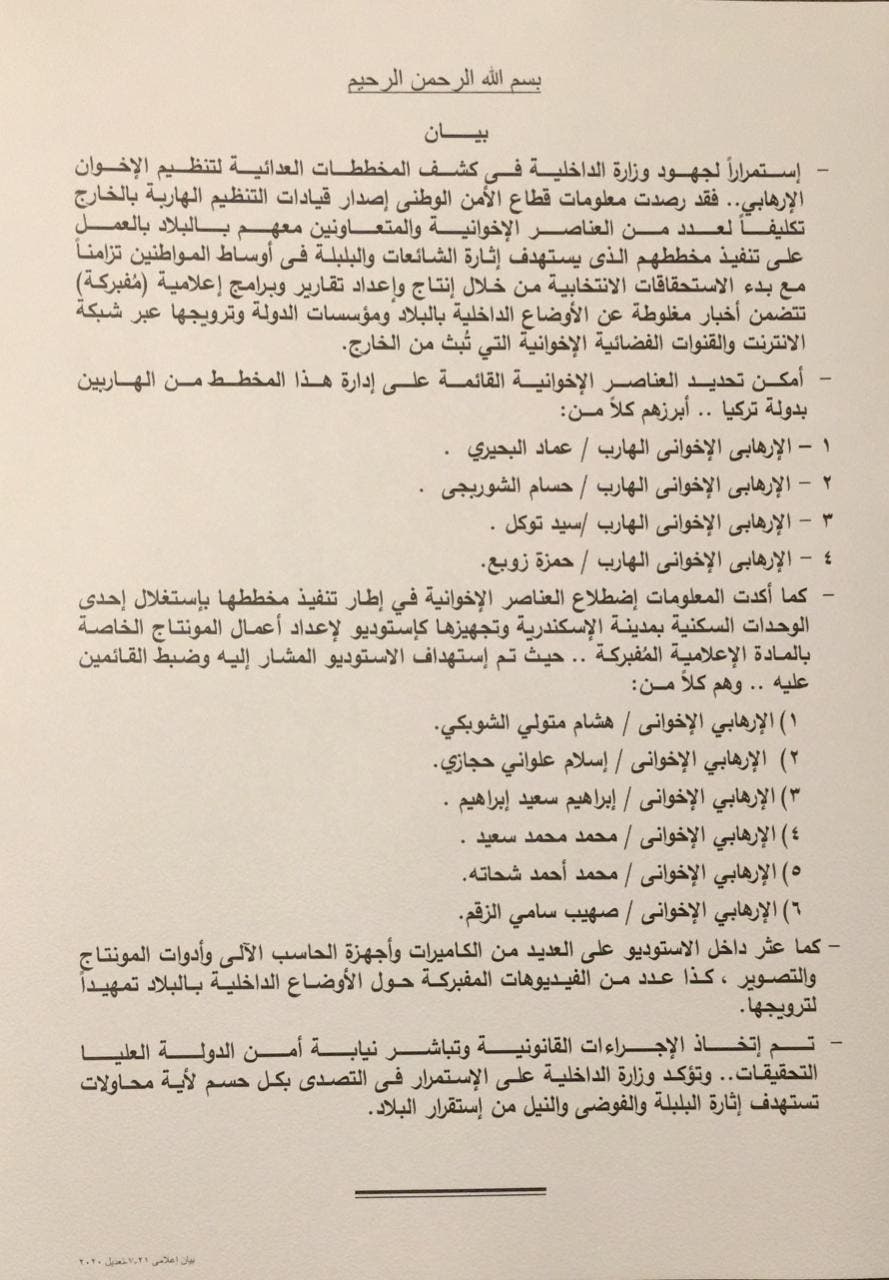وقالت الداخلية في بيان رسمي، إنه تم تحديد العناصر الإخوانية القائمة على إدارة هذا المخطط من الهاربين في تركيا، وهم: عماد البحيري، حسام الشوربجي، سيد توكل، حمزة زوبع.
