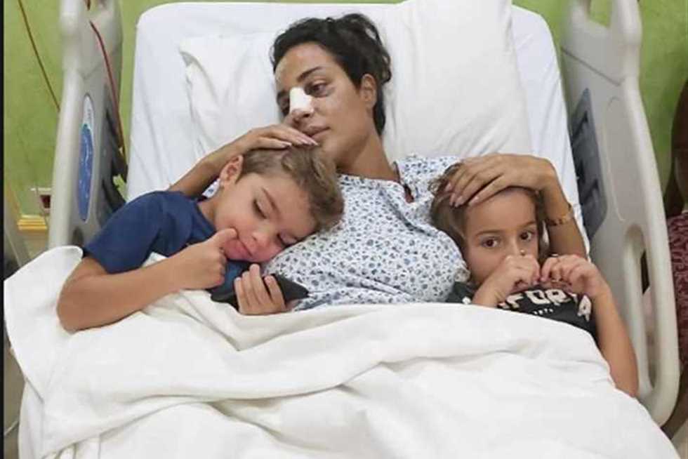 وظهرت نادين برفقة ولديها داخل المستشفى بوجه مليء بالكدمات الزرقاء وآثار جروح واضحة خاصة بمنطقة الأنف والوجنتين وأسفل العين.