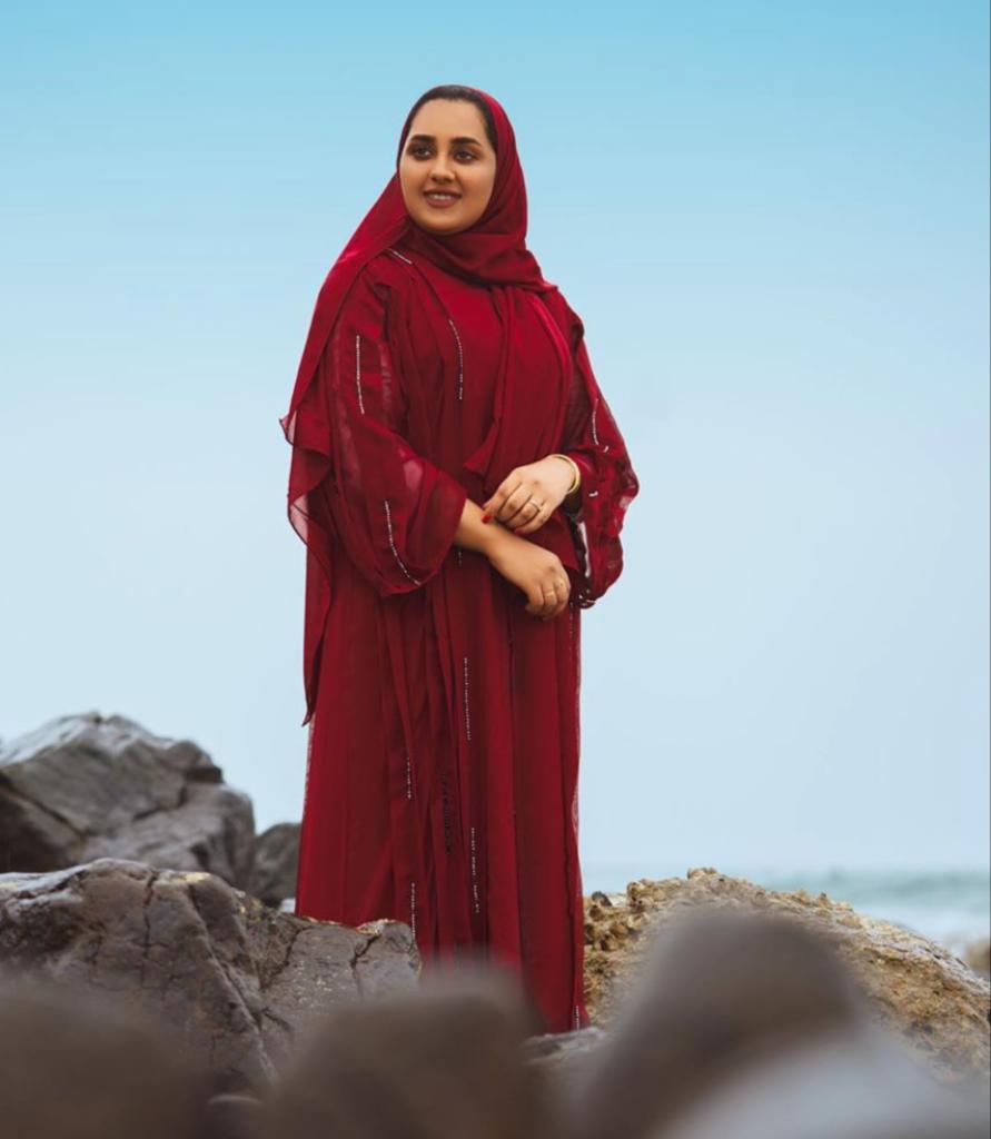 تُعتبر مدونة الموضة المختصة بالأزياء والجمال والموديل آلاء البلوشي من أكثر الفتيات العمانيات اختيارًا للعباية في إطلالاتهن على مواقع التواصل الاجتماعي، وتنشر الكثير من الصور بالعباية على حسابها الرسمي في إنستجرام، حيث يتابعها فيه أكثر من ٣٣٠ ألف شخص. ومن وحيها نقدم لكِ عدة خيارات بالعبايات الداكنة والحيادية التي تمتاز بإخفاء عيوب الجسم وإضفاء المزيد من الحشمة والأناقة، حيث ارتدت عباية سوداء مزينة في أطراف الأكمام بالأبيض المزين بالترتر والزهور بطريقة شبابية، وأطلت بعباية حمراء جذابة مزينة بالفصوص الطويلة السوداء لخيار أنثوي، وظهرت بعباية بنية مصممة بمطاط ناعم في الأكمام ومزينة بالقماش السماوي المطرز بالأبيض لخيار مناسب للشابات، وتأنقت بعباية سوداء مزينة بتطريزات بيضاء متعرجة في الأطراف، لخيار مناسب لكل الإطلالات.