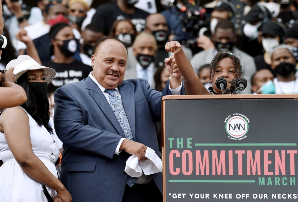وقال مارتن لوثر كينغ الثالث، حفيد مارتن لوثر كينغ: "بطرق شتى، نقف معاً اليوم في ظلال التاريخ، لكننا نصنع التاريخ معاً الآن، يسير الأمريكيون جنباً إلى جنب، كثير منهم للمرة الأولى، ونحن نطالب بتغيير هيكلي حقيقي ودائم".