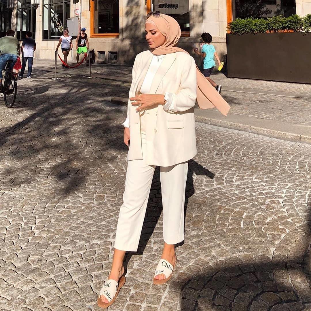 بالنظر إلى اطلالات الفاشينيستا المحجبات التي رصدناها من حساباتهن على انستقرام ستلاحظين تمسكهن بالبدلات البيضاء في مختلف المناسبات حيث تعود البدلة البيضاء بقوة هذا الصيف وكانت قد سجلت حضور كبير ضمن مجموعات الأزياء الجاهزة والكوتور، ننصحك بتنسيقها مع قميص باللون الأبيض لتحصلي على لوك موحد اللون يزيدك طولًا واعتمري إما طرحة بيضاء أو طرحة وتوربان باللون البيج على أن يكون الحذاء من نفس لون الطرحة.