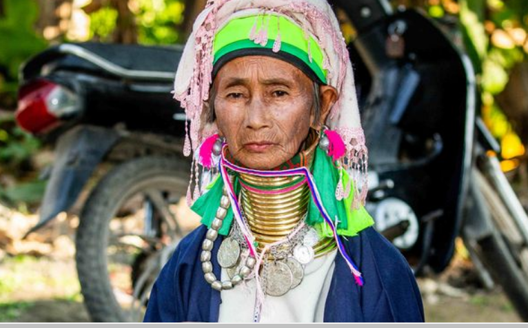تعرض إحدى الصور المدهشة امرأة مسنة يتجاوز طول رقبتها حوالي 17 سم وهي تعرض بفخر عصبات رقبتها الذهبية التي قد يصل وزنها إلى 6 كغم تقريباً مجتمعة، وتُصنع من النحاس أو البرونز.