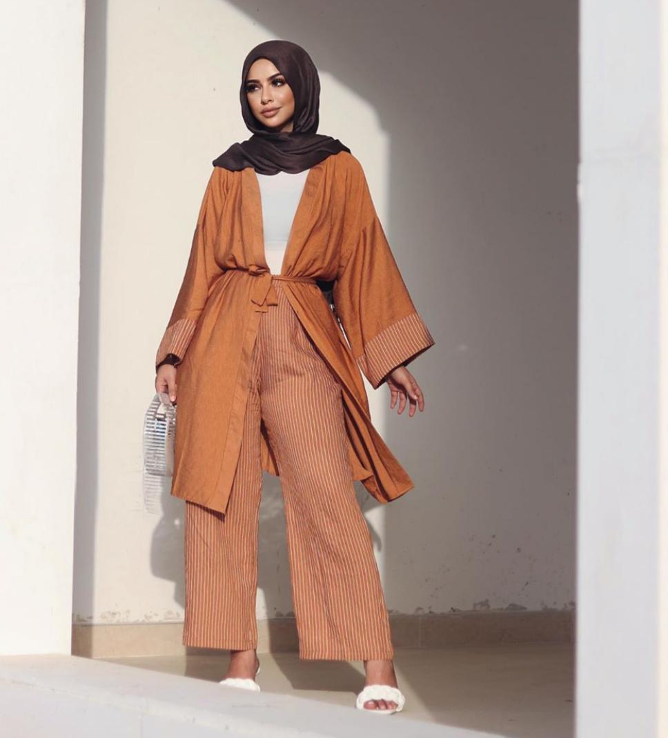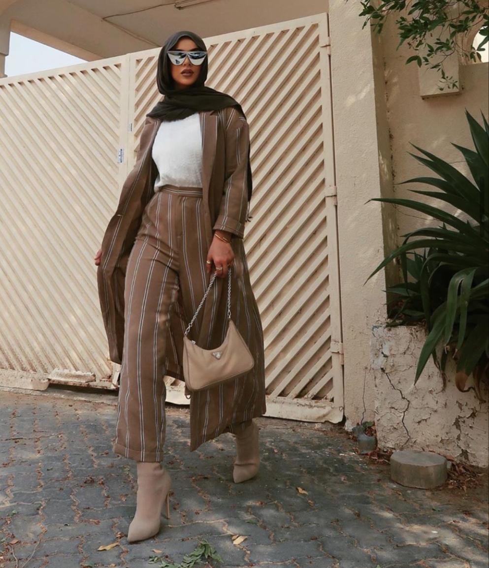 يعتبر اللون البني من أكثر الألوان المعبرة عن الخريف، لذا استوحينا لكِ -عزيزتي- من مدونة الموضة سهى عدة خيارات محتشمة باللون البني، حيث أطلت ببليزر بني وتنورة سماوية من قماش الساتان، وأكملت تفاصيل إطلالتها بالفضي والسماوي لمظهر مميز أنيق، ولإطلالة محايدة ظهرت ببنطال وبليزر باللون البني مع تيشيرت أبيض وحجاب ونظارة باللون الأسود، وارتدت معطف الكيمونو البني المخطط بالأبيض مع بنطال واسع بذات تصميم المعطف، واعتمدت لتكمل جمال إطلالتها على اللونين البيج والبني لخيار مميز.