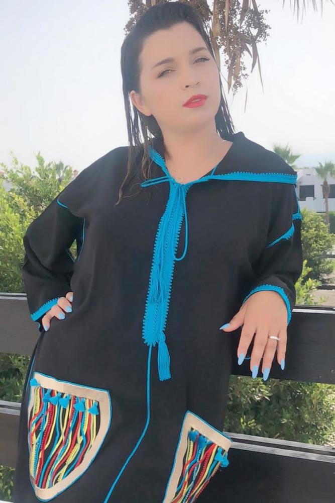 اللون الأسود من أكثر الألوان اختيارًا في الأزياء عامة وفي القفاطين والجلابيات بشكل خاص، حيث يوفر الكثير من الفخامة والأناقة لمُرْتَدِيه، بالإضافة إلى إخفاء عيوب الجسم، وقد تأنقت فرح الفاسي بجلابية سوداء واسعة مطرزة بالذهبي ومزينة برسومات الزهور الملونة في الأسفل وفي أطراف الأكمام، وأكملت جمال الإطلالة بحذاء رياضي أسود مطرز بالزهور الملونة مع تسريحة مرفوعة للشعر ومكياج زهري لمظهر أنيق وناعم.