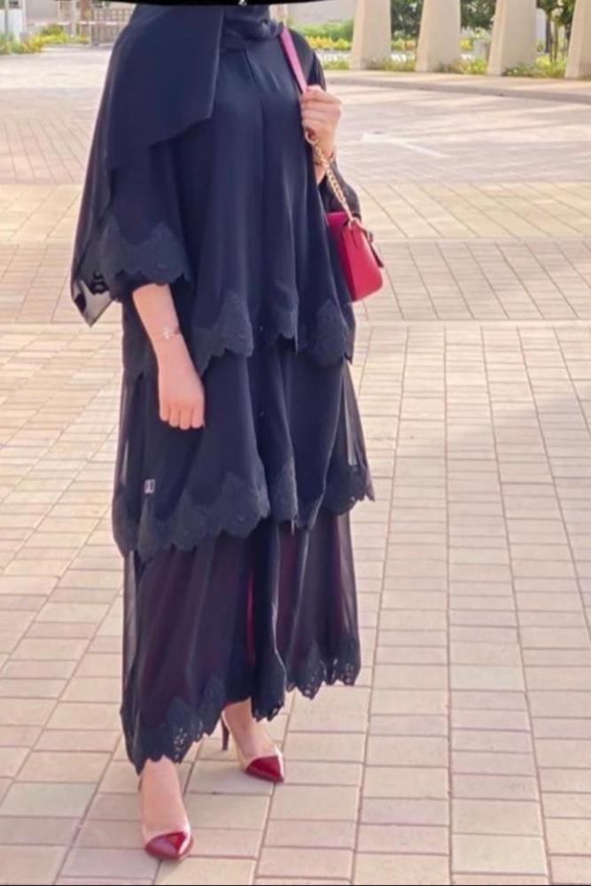 إن كنتِ بحاجة لإطلالة أكثر نعومة وبساطة بعبايات الدانتيل فيمكنك اختيار عباية سوداء مزينة بأكمام مصممة من قماش الحرير الأبيض ومزينة من الأسفل بقماش الدانتيل الشفاف؛ لتمنحك إطلالة جذابة وفريدة من نوعها، أو تأنقي بالعباية السوداء المزينة من الجزء العلوي بقماش مصمم كمعطف خفيف من الدانتيل، واخترنا لكِ عباية مميزة مصممة بثلاث طبقات مكملة من أطرافها بقماش الدانتيل الناعم لتمنح مظهر مرتديتها إطلالة أنثوية بسيطة ومناسبة لكل المشاوير، ويمكنك تنسيقها مع حقيبة وحذاء باللون الأحمر لزي كلاسيكي.