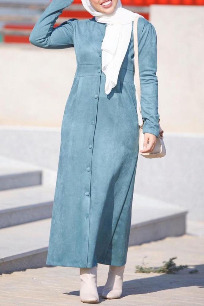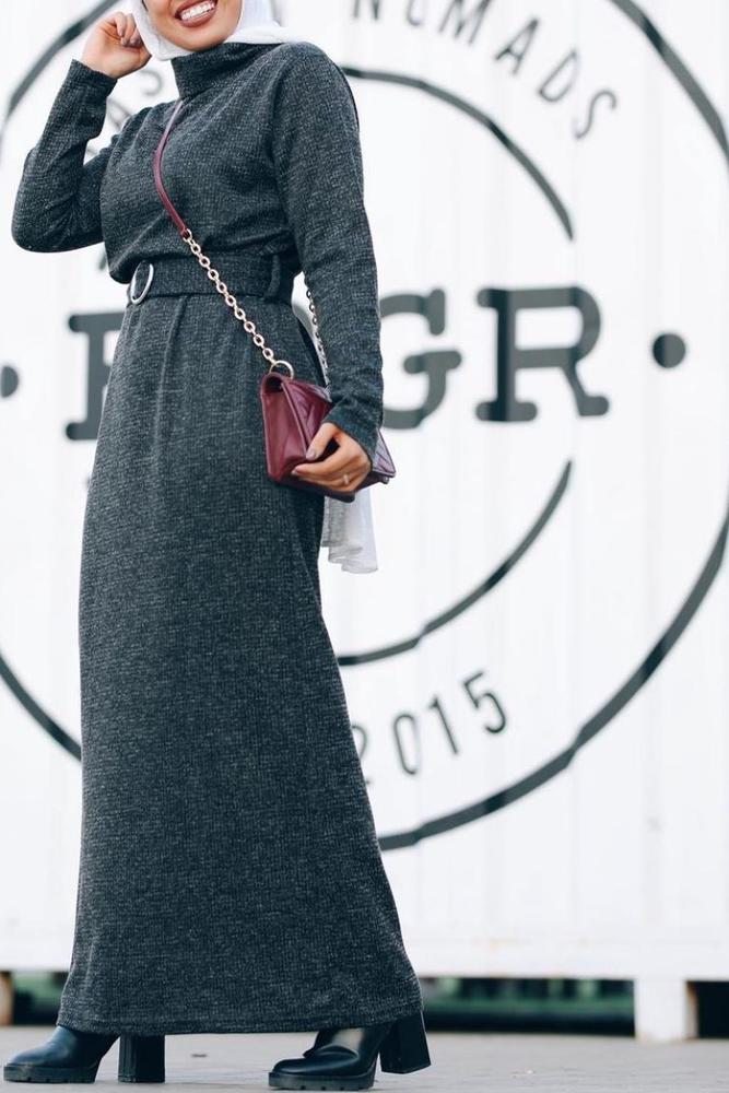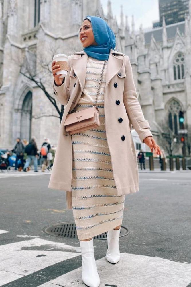 كما اخترنا لكِ فستانًا باللون البيج مزينًا بخطوط عرضية ملونة بالأبيض والأزرق مع معطف من الفرو البني المزين بأزرار سوداء، وأكملي إطلالتك بحجاب أزرق مع حذاء بوت أبيض أو العكس، ولأنه لا غنى عن اللون الرمادي في الشتاء فيمكنك التأنق بفستان رمادي مصمم بقماش ثقيل ورقبة مرتفعة مع حزام محدد للخصر، أو اظهري بفستان من المخمل الأزرق المصمم بقصة طويلة ناعمة ومزين بأزرار مع إطلالة يكسوها اللون الأبيض لتناسب الصباح، أو يكسوها اللون الأسود للمشاوير المسائية.