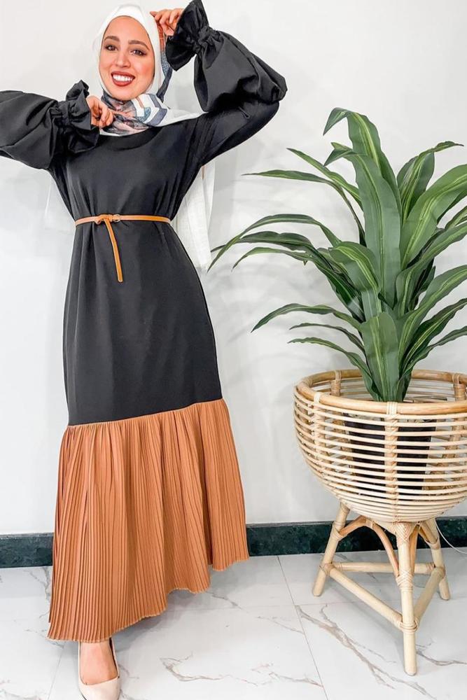 اللون الأسود هو لون ملكي يعطي فخامة وتميزًا ورونقًا لكل من يرتديه، وهو مناسب بشكل كبير لهذا الشتاء ليوحي بالدفء والفخامة في الوقت ذاته، فإن كنتِ بحاجة لفستان رياضي ناعم فيمكنك ارتداء فستان أسود طويل مزين بسحّاب في المنتصف مع خطوط بيضاء في الرقبة والأكمام، وإكمال تفاصيل الإطلالة باللونين الأسود والأبيض لتحصلي على إطلالة حيادية مبهرة، أو تزيني بفستان أسود مصمم بخطوط نحيلة بيضاء مع حزام من الجلد الأسود للخصر، وأكملي مظهرك بحقيبة وحجاب باللون الأبيض مع حذاء بوت أسود لإطلالة أكثر دفئًا، وإن كنتِ تبحثين عن فستان بسيط بأسلوب مواكب لموضة هذا العام فارتدي فستانًا أسود مصممًا بأكمام منفوخة ومزينة بمطاط مع حزام نحيل بني، وأضيفي لمسة مبهرة من خلال إضافة اللون البني في أسفل الفستان ليضفي طابعًا مميزًا، واختاري إكسسوارات الإطلالة بالألوان الحيادية.