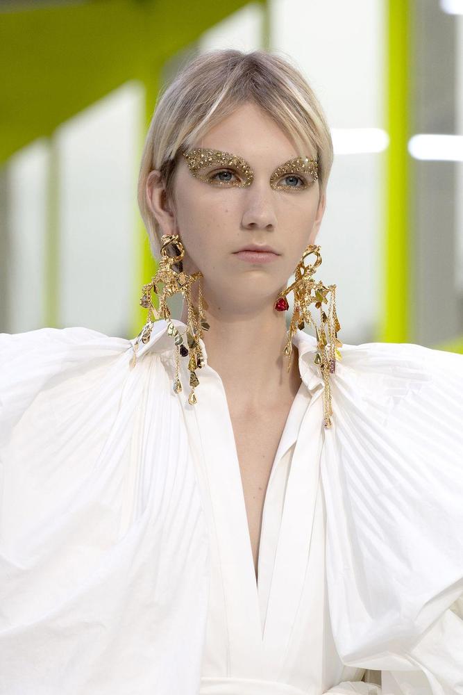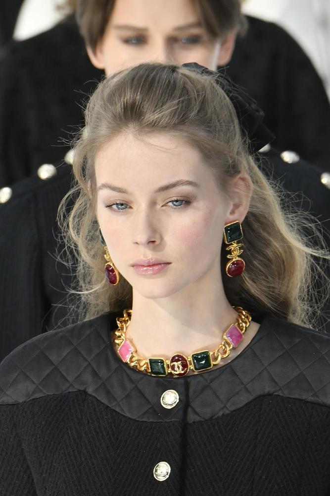 كما قدمت ماركة شانيل Chanel أقراط ذهبية مرصعة بأحجار بألوان الأحمر والأخضر الداكنة التي تناسب موسم الشتاء الدافىء.