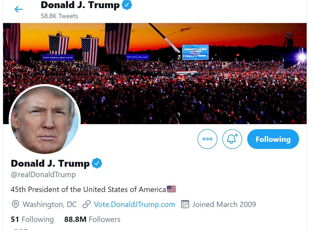 ويملك ترمب على تويتر 88.8 مليون متابع، فيما يملك بايدن 20.2 مليون.