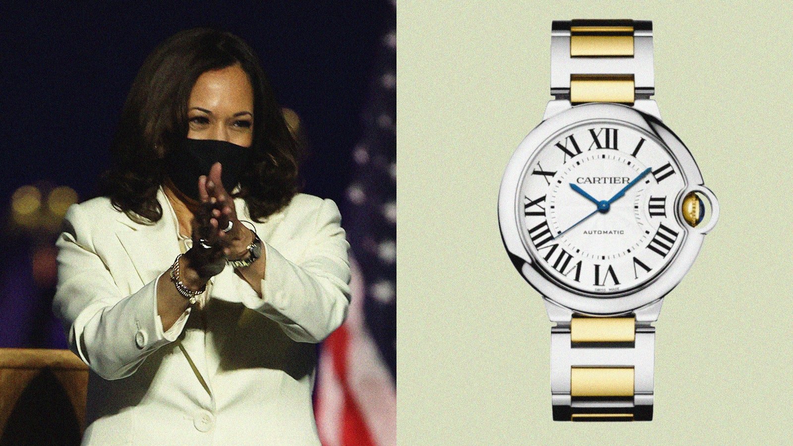 ترتدي نائبة الرئيس المُنتخب السيناتور كامالا هاريس ساعة ألون بلو دو كارتييه، والتي تناسب ملابسها وتضيف إلى إطلالتها تميزًا، وتجعلها تظهر في مظهر لا يشوبه شائبة. الرئيس الوحيد أو نائب الرئيس الذي عُرف بارتداء الساعات الكارتييه هو جون إف كينيدي، إذ اشترت له زوجته جاكي ساعة بقرص دائري في عيد زواجهما الرابع.