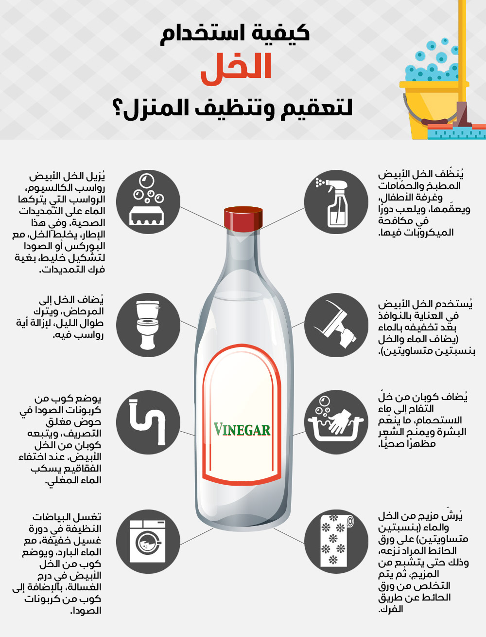 1-يُنظّف الخل الأبيض المطبخ والحمّامات وغرفة الأطفال، ويعقّمها، ويلعب دورًا في مكافحة الميكروبات فيها.