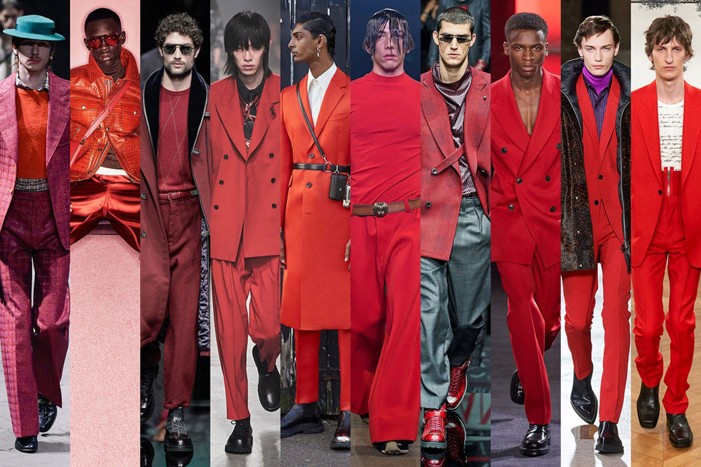 روغم أن الأحمر من الألوان التي يصعب على الرجال تنسيقه أو إعتماده كجزء من الطلة اليومية لكن غالبية مصممي الأزياء قدموا الأحمر بمختلف تدرجاته. في عروض توم فورد،جورجيو أرماني ومارني ظهرت البدلات الحمراء بتدرجات مختلفة، بينما في عروض غوتشي ظهرت البدلات القرميدية اللون.
