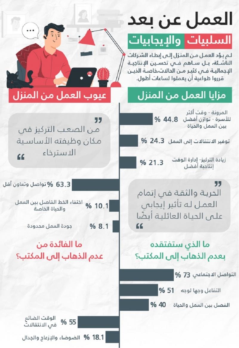 فيما تتمثل سلبياته في قلة التواصل والتعاون بين فريق العمل واختفاء الخط الفاصل بين العمل والحياة الخاصة مع صعوبة التركيز في ظل غياب مكان العمل الأساسي.