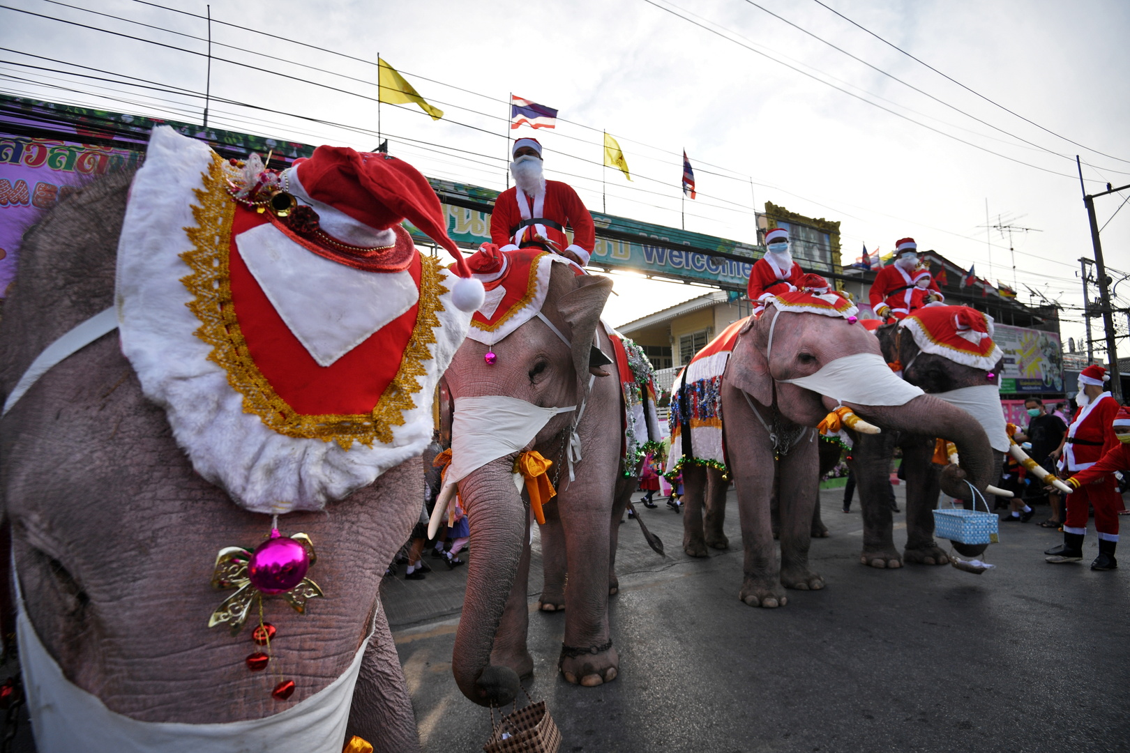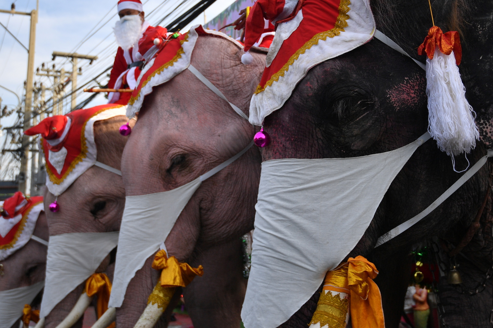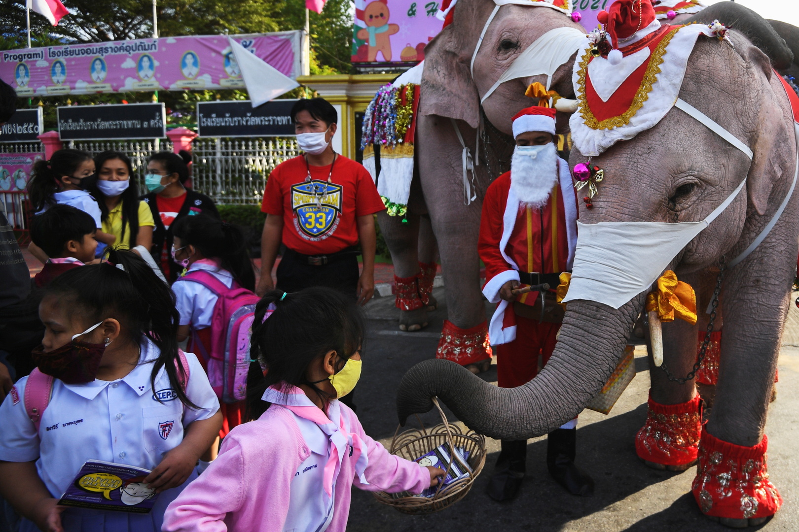 واعتلى مدربو أفيال في زي بابا نويل ظهور حيواناتهم التي وزعت الكمامات من سلال معلقة في خراطيمها على طلاب مدارس وقائدي دراجات وسيارات في إقليم أيوتايا بوسط البلاد الأربعاء 23 ديسمبر 2020.