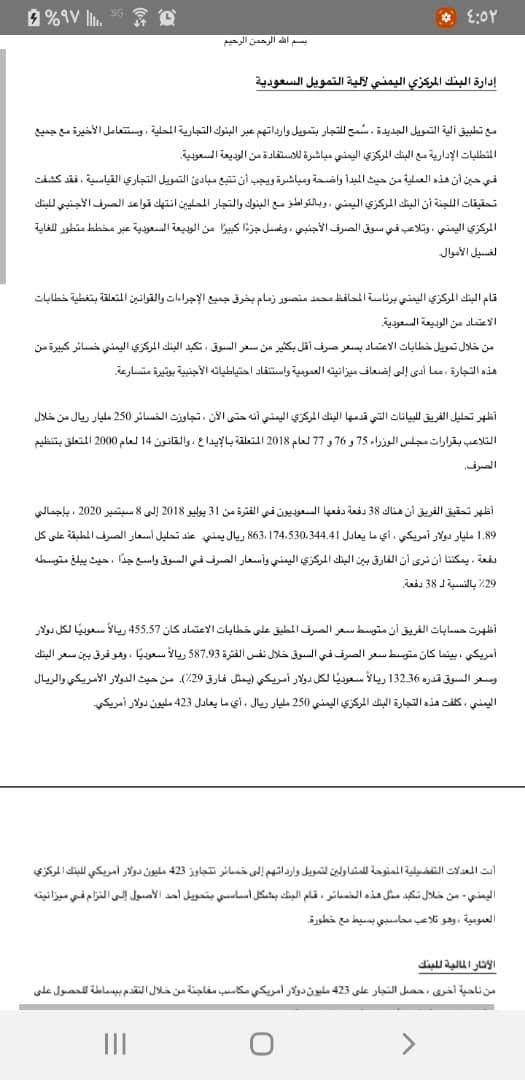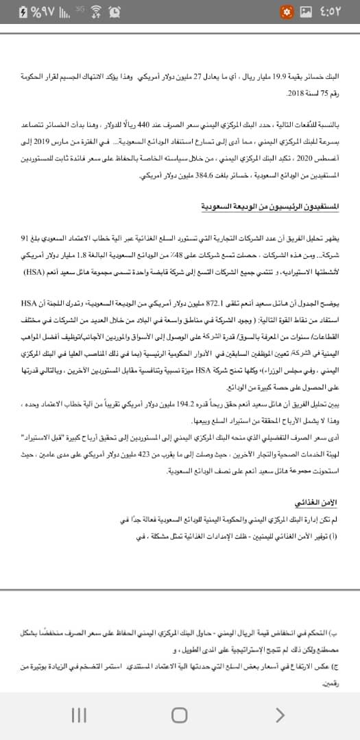 ان مـبلغ الـ 423 مـليون دولار أمـريـكي عـبارة عـن أمـوال عـامـة تـم تـحويـلها بـشكل غـير قـانـونـي إلـى شـركـات خـاصـة دون تـفسير واضــح ، وفشــلت المســتندات الــتي قــدمــها الــبنك المــركــزي الــيمني إلــى الــلجنة فــي تــفسير ســبب تــبنيهم لمـثل هــذه الإســتراتــيجية المدمرة .