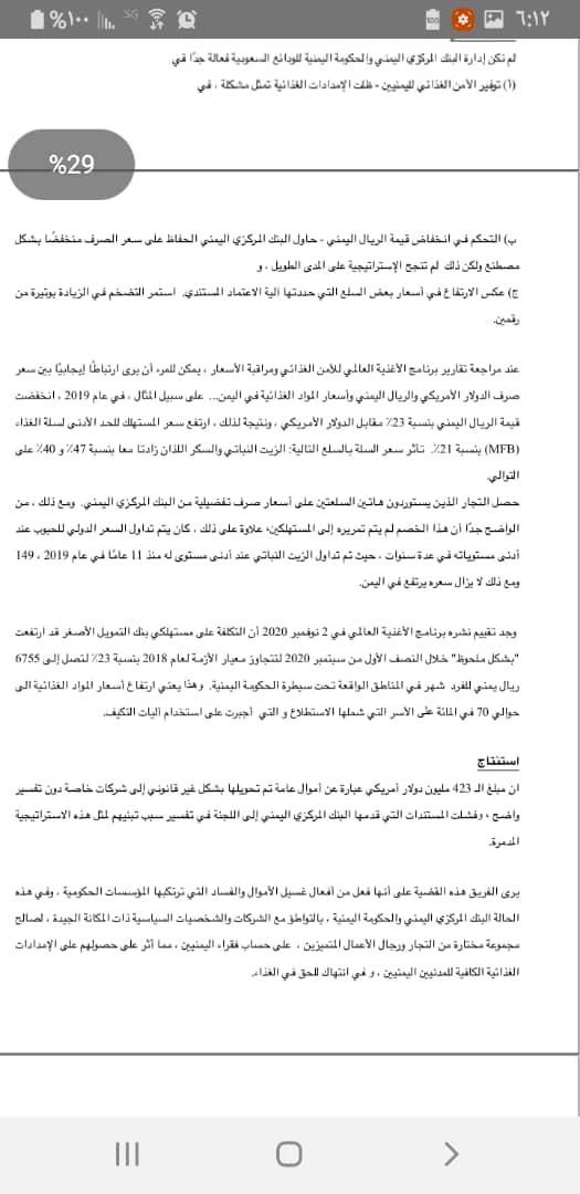 ويــرى الــفريــق أن هــذا يــمثل حــالــة واضــحة لــغسيل الأمــوال وتــحويــل الأمــوال الــتي ارتــكبتها مــؤســسة حــكومــية ، فــي هــذه الــحالــة البنك المركزي اليمني ، لصالح مجموعة مختارة من التجار ورجال الأعمال المميزين .