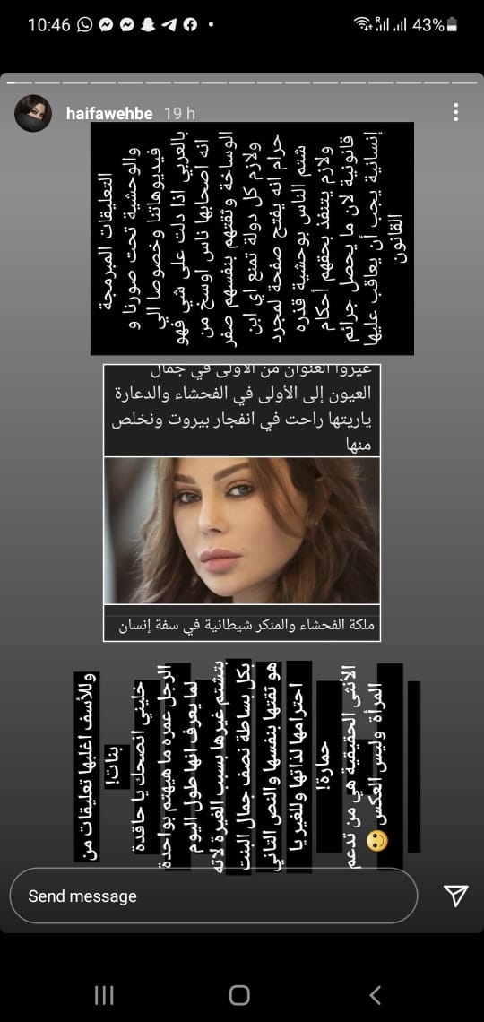 من جانبها، قررت هيفاء وهبي الرد، عبر خاصية "ستوري" على "إنستقرام"، وأعادت نشر التعليق مرة أخرى، وكتبت: "التعليقات المبرمجة والوحشية تحت صورنا وفيديوهاتنا وخصوصا اللي بالعربي إذا دلت على شيء فهو إنو أصحابها ثقتهم بنفسهم صفر".