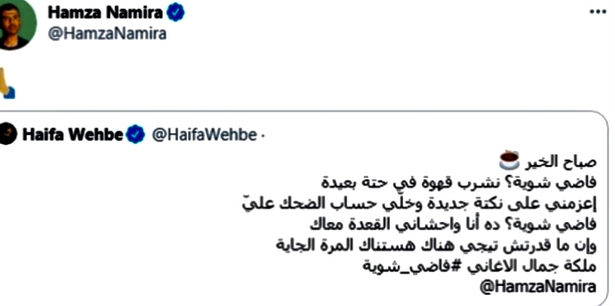 وعبر حسابها بموقع تويتر ، كتبت هيفاء وهبي: "صباح الخير.. فاضي شوية؟.. نشرب قهوة في حتة بعيدة، إعزمني على نكتة جديدة وخلّي حساب الضحك عليّ".وتابعت "فاضي شوية؟.. ده أنا واحشاني القعدة معاك، وإن ما قدرتش تيجي هناك، هستناك المرة الجاية"، ووصفتها بملكة جمال الأغاني.