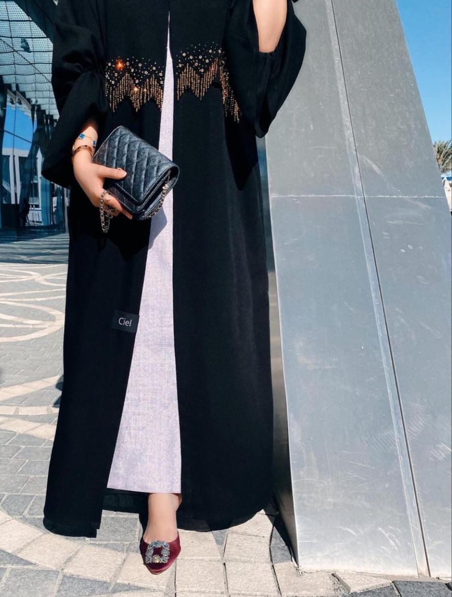 ربما تواجه بعض السيدات صعوبة في تنسيق العباية الخليجية السوداء بأسلوب يجمع بين الحشمة والأناقة العصرية، لذا نلهمكن بعض الأفكار من فاطمة محمد؛ حيث ظهرت بعباية سوداء مزينة بخيوط بيضاء في الأسفل مع حذاء أبيض وحقيبة من الجلد الأسود، وأطلت بعباية سوداء مزينة بفصوص صغيرة مع إطلالة كاجوال باللونين البني والأسود، وزينت مظهرها بحقيبة برونزية صغيرة مع حذاء بكعب أبيض مزين بفصوص فضية، وللمناسبات تألقت بعباية سوداء مزينة بفصوص كريستالية وريش باللون الأسود مع فستان أبيض وحقيبة مطبعة بجلد الثعبان البني وحذاء مزين بطبعات جلد الثعبان، وفي مظهر ناعم تزينت بعباية سوداء مزينة بتطريزات برونزية في منطقة الصدر مع فستان أبيض وحذاء من المخمل العنابي.