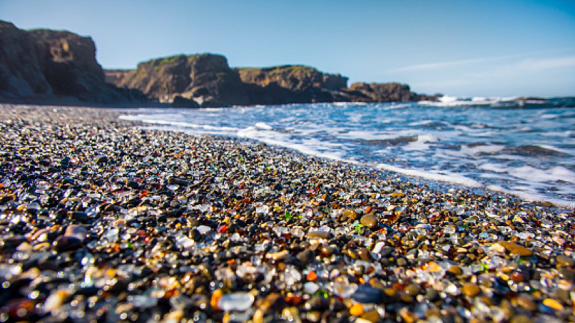 يقع الشاطئ الزجاجي في فورت براغ بولاية كاليفورنيا، ويتميز بتناثر قطع من الزجاج الملون الجذاب على حافة المياه من جميع الجوانب، وبحسب العلماء فإن تلك القطع من الزجاج ليست صخورًا طبيعية.