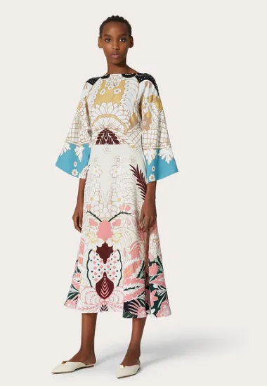 قدمت ماركة Valentino العديد من التصميمات المميزة للفساتين الريفية، أعجبنا منها هذا التصميم لفستان متوسط الطول، صُمم من توب بأكمام واسعة متوسطة الطول مع تنورة بتصميم A line، فيما امتزجت ألوانه بين الأصفر الباستيل والأزرق الفاتح والكاروهات الأبيض مع الأصفر، إضافة إلى بعض نقشات الورود الكبيرة باللون الوردي على التنورة.