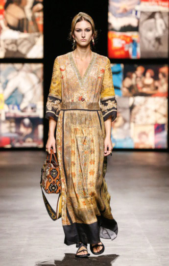 لإطلالة أكثر أناقة بفستان ريفي يناسب الخروجات المسائية، قدمت ماركة Dior هذا التصميم المميز لفستان طويل يجمع بين اللون البيج مع الأسود والبرتقالي والبني الفاتح، فيما جاء تصميم التوب بفتحة صدر على شكل حرف V وأكمام متوسطة الطول، أما التنورة فجاءت طويلة بتصميم A Line، مع أطراف باللون الأسود، تتناسق مع أساور الأكمام.
