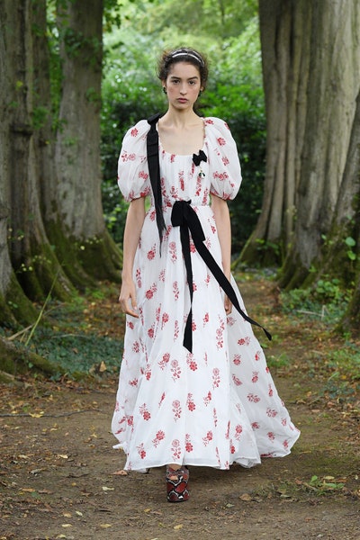 لإطلالة أكثر نعومة وأنوثة بالفساتين الريفية، قدمت ماركة Erdem هذا التصميم الأنيق لفستان أبيض مُطبع بالورود الحمراء، وهو الفستان الذي صُممت تنورته بتصميم A line منفوش، مع توب ذي أكمام قصيرة منفوخة، وفتحة صدر دائرية، إضافة إلى حزام أنيق على الخصر صُمم على شكل فيونكة ذات أشرطة طويلة متدلية، إضافة إلى فيونكة صغيرة باللون الأسود على أحد جانبي الصدر.