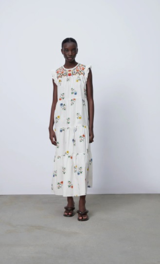 لإطلالة أكثر بساطة، يُمكنكِ الاستعانة بهذا التصميم المميز لفستان ريفي طويل من ماركة Zara، وهو فستان مُصمم من القطن باللون البيج المُطرز بالورود الكبيرة وفروع الأشجار باللون البرتقالي.